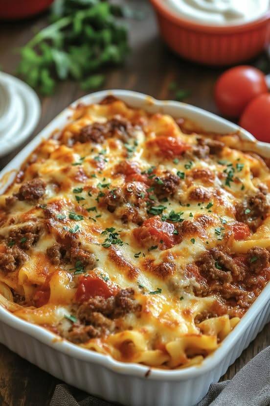 This recipe creates a layered casserole with ground beef, a flavorful tomato sauce, noodles, and plenty of cheese.