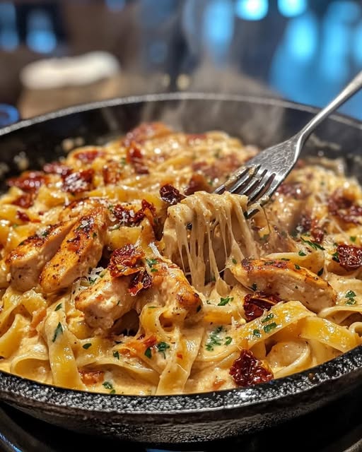 Creamy Sun-Dried Tomato and Chicken Fettuccine Ingredients: 12 oz fettuccine pasta 2 boneless, skinless chicken breasts, sliced into thin strips 1 cup heavy cream ½ cup grated Parmesan cheese ⅓ cup sun-dried tomatoes, chopped 1 small onion, finely chopped 2 garlic cloves, minced 1 tablespoon olive oil 1 teaspoon dried basil ½ teaspoon red pepper flakes (optional) Salt and black pepper to taste Fresh parsley, chopped (for garnish) Directions: Read more on next page