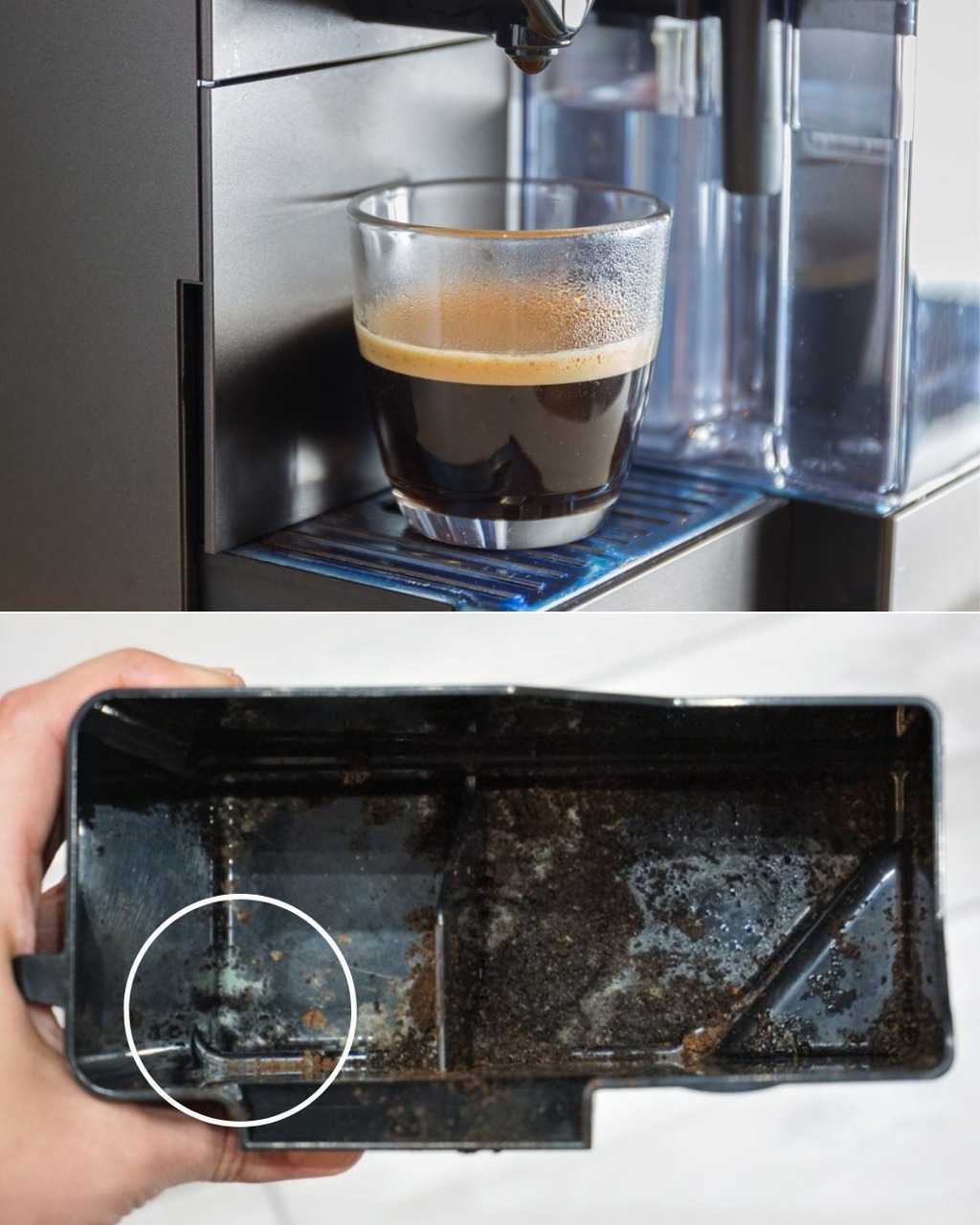 • Check the water reservoir, drip tray, filter basket, and spouts for any black, green, or slimy residue.